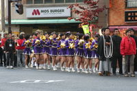 We found our way out of the Imperial Park and decided to take a bus to the Kitano Tenmangu Shrine where there is a Tenjin-san market fair on the same day. While waiting for the bus… there was a parade coming towards the junction. It was led by cheerleaders. CG was excited and stood by with his camera and zoom lens to snap photos.